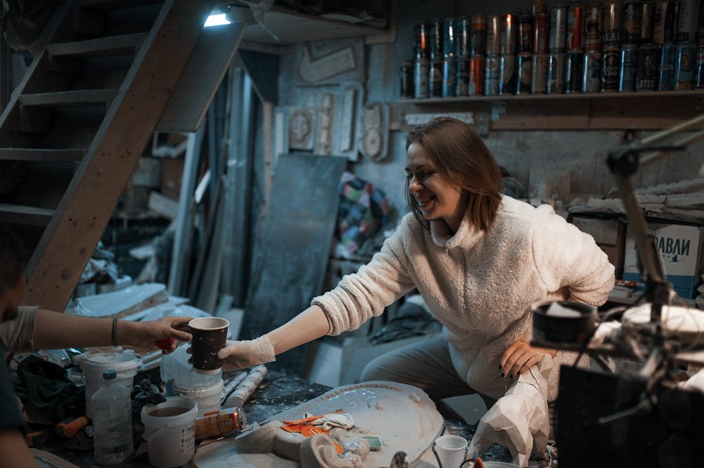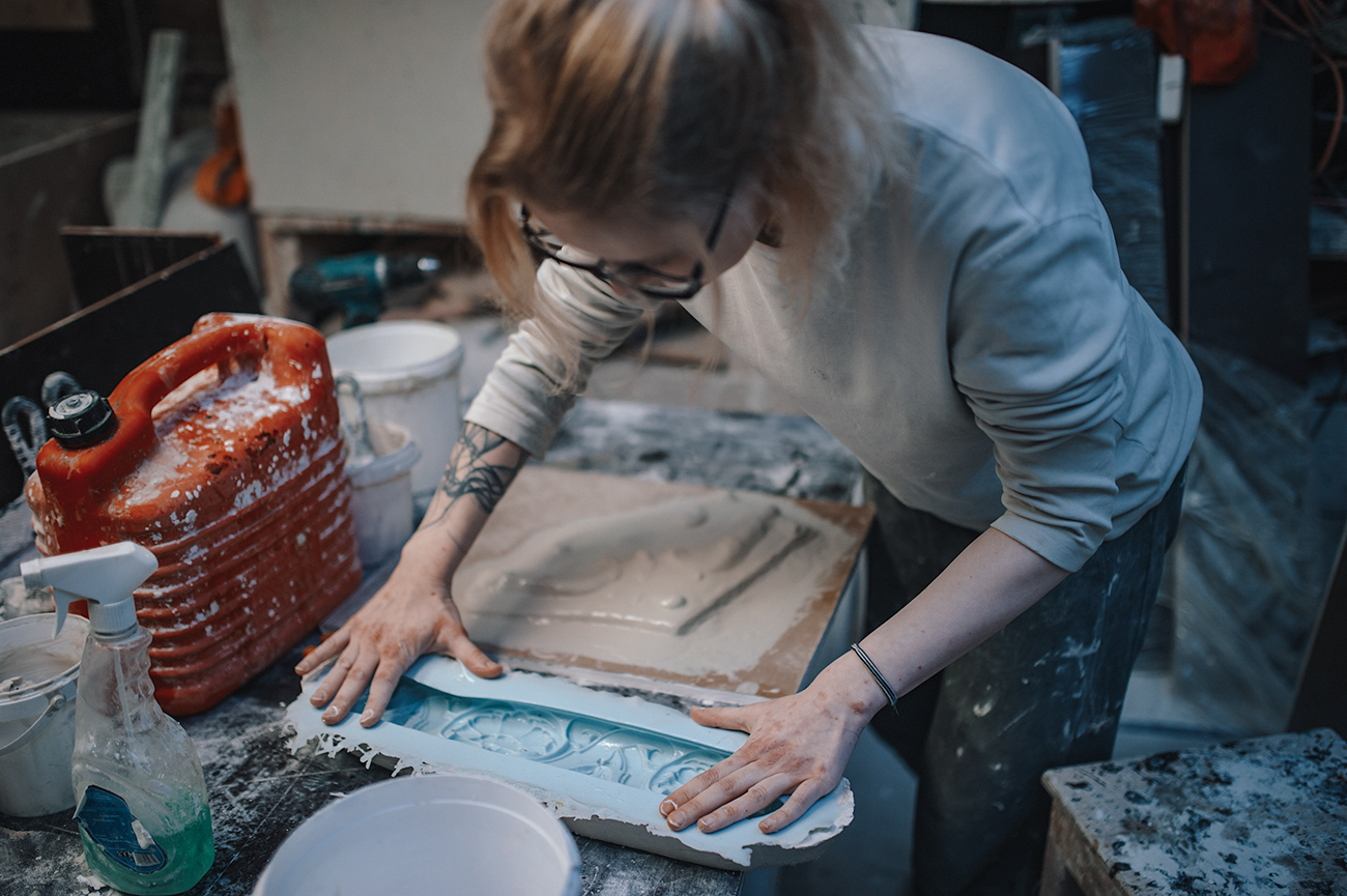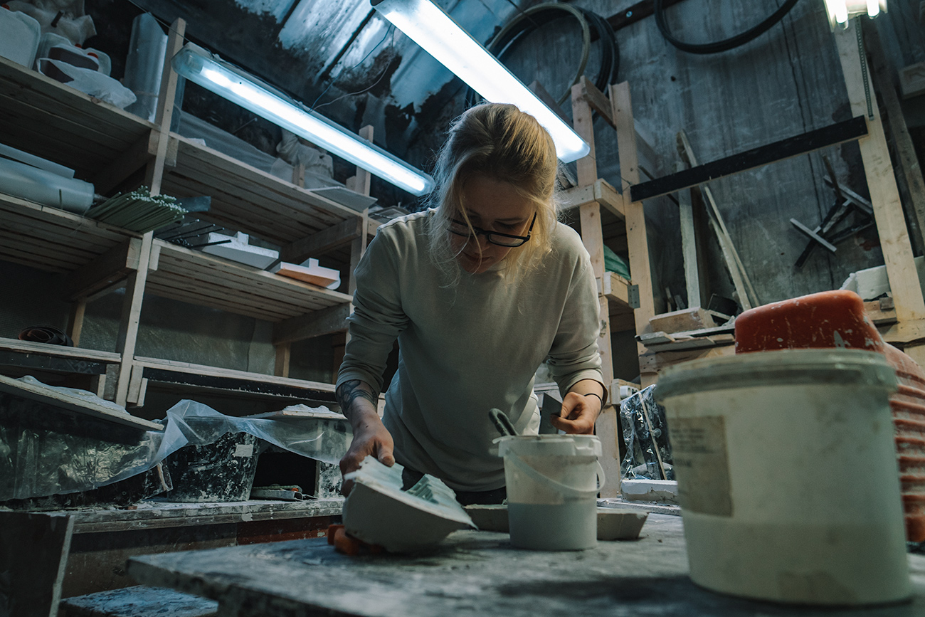 — Эту мастерскую снимает мой босс. С ним меня познакомила одна реставраторка года 2-3 назад. Так и работаю там периодически. Сама мастерская маленькая, пыльная, но очень атмосферная и дружная. В разное время там работают разные люди. Сейчас мы с девочками занимаемся подготовкой моделей для реставрации одного здания на Ваське. А мальчики и мужчины делают бетонные изделия на фасад.